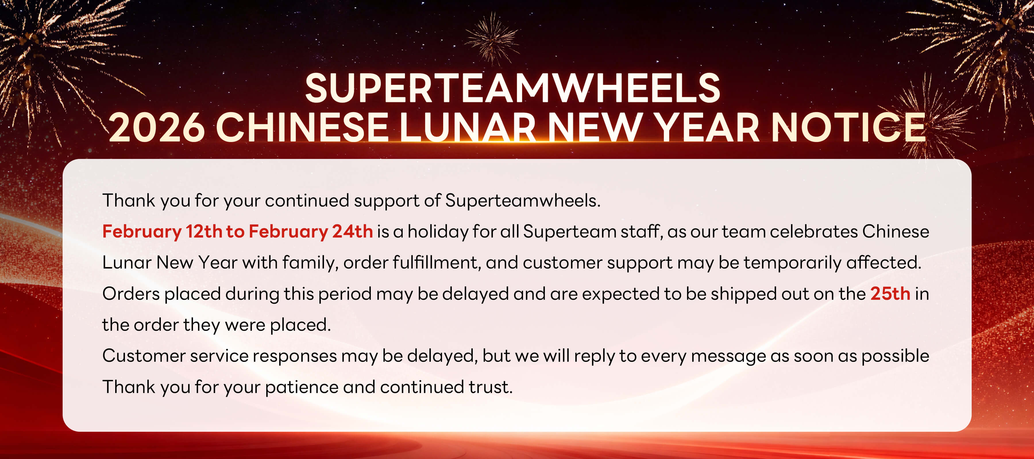Thank you for your continued support of Superteamwheels. February 12th to February 24th is a holiday for all Superteam staff, as our team celebrates Chinese Lunar New Year with family, order fulfil...